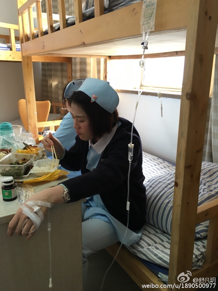3月28日,網友“舒凡玥”通過微博上傳了一張照片,照片上,一位年輕女護士在醫院值班室內一邊吃飯一邊輸液。“舒凡玥”表示:好艱辛,吃飯時間趕著給自己輸液,然后還要繼續上班。照片很快被網友轉發了出去,獲得不少網友點贊。