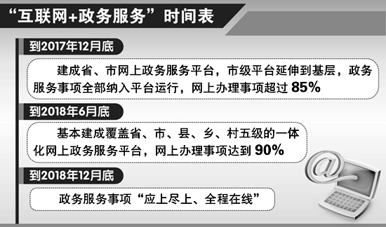 規劃明確了推進“互聯網+政務服務”的“時間表”。到2017年12月底,建成省、市網上政務服務平臺,市級平臺延伸到基層,政務服務事項全部納入平臺運行,網上辦理事項超過85%,在全省基本實現群眾和企業辦事“最多跑一次”,努力做到本級公共服務事項1個工作日、企業開辦3個工作日、不動產登記證5個工作日、工業建設項目施工許可證50個工作日內完成審批手續。到2018年6月底,完成全省政務服務事項標準化,基本建成覆蓋省、市、縣、鄉、村五級的一體化網上政務服務平臺,網上辦理事項達到90%。到2018年12月底,政務服務事項“應上盡上、全程在線”,實行跨部門、跨層級、跨區域業務協同辦理。