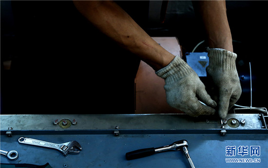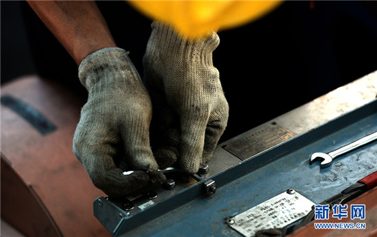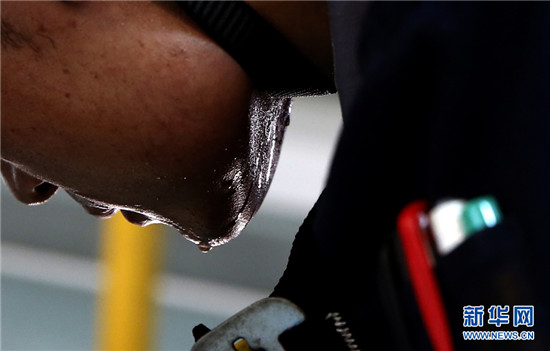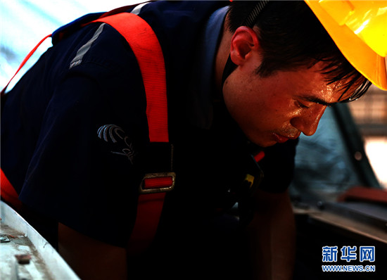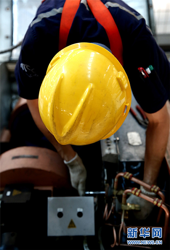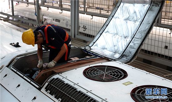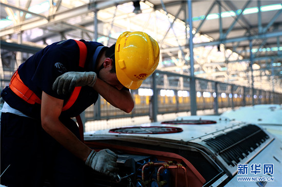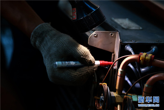在高達50℃的動車檢修廠內,動車組機械師李洲正在對CRH380B型動車組空調系統進行故障處理。新華網 石璐 攝