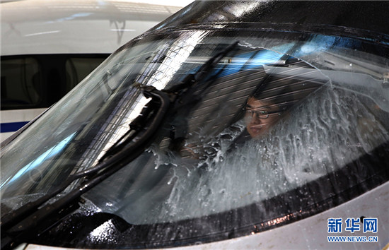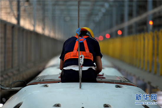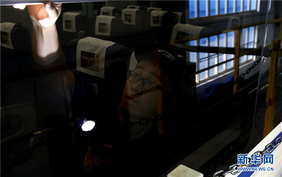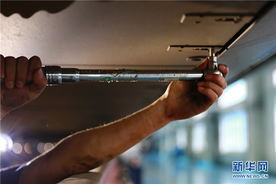 在高達50℃的動車檢修廠內,工作人員正在為動車“體檢”。新華網 陳揚 攝