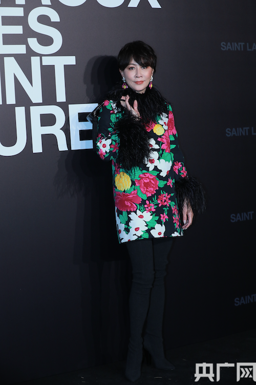 劉嘉玲以品牌2021春夏系列中的一件印花連身小禮服亮相,領口與袖口的夸張羽毛裝飾十分搶鏡。