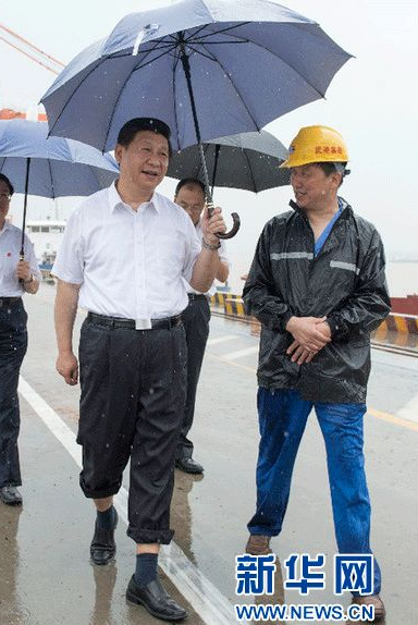 2013年7月21日,習(xí)近平冒雨來到武漢新港陽邏集裝箱港區(qū)考察