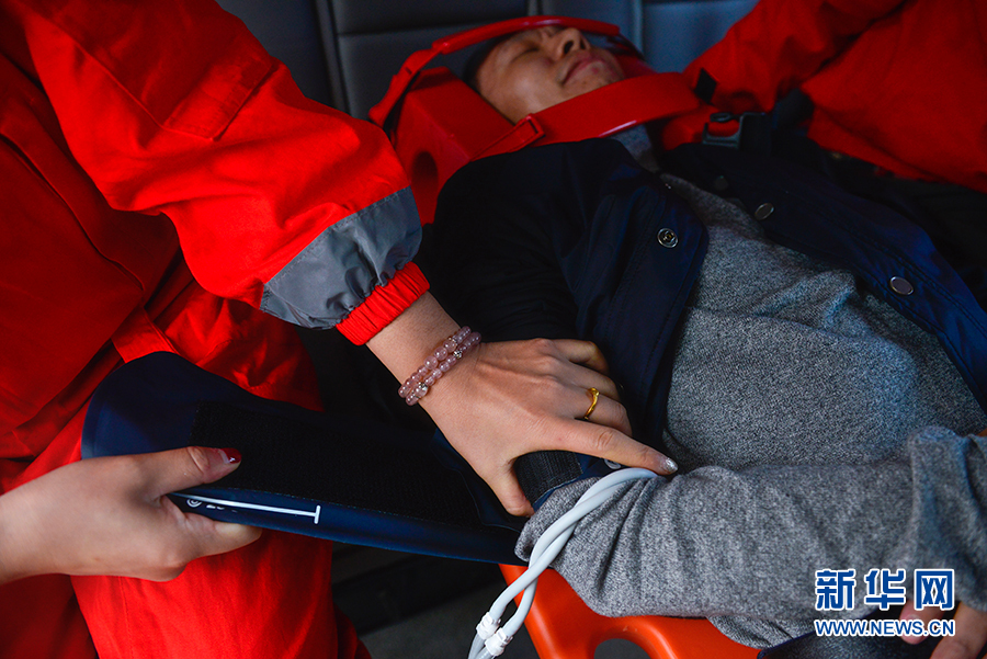 11月12日,航空應急醫(yī)療救援在重慶市璧山區(qū)舉行,轉(zhuǎn)移到直升機后,救援人員對病人實施必要的急救措施。新華網(wǎng) 李相博 攝 -