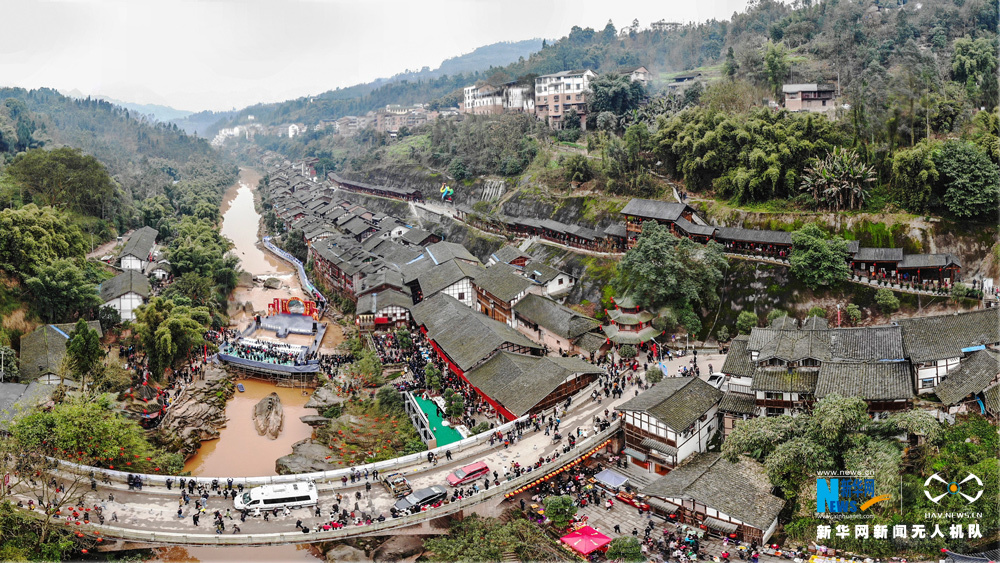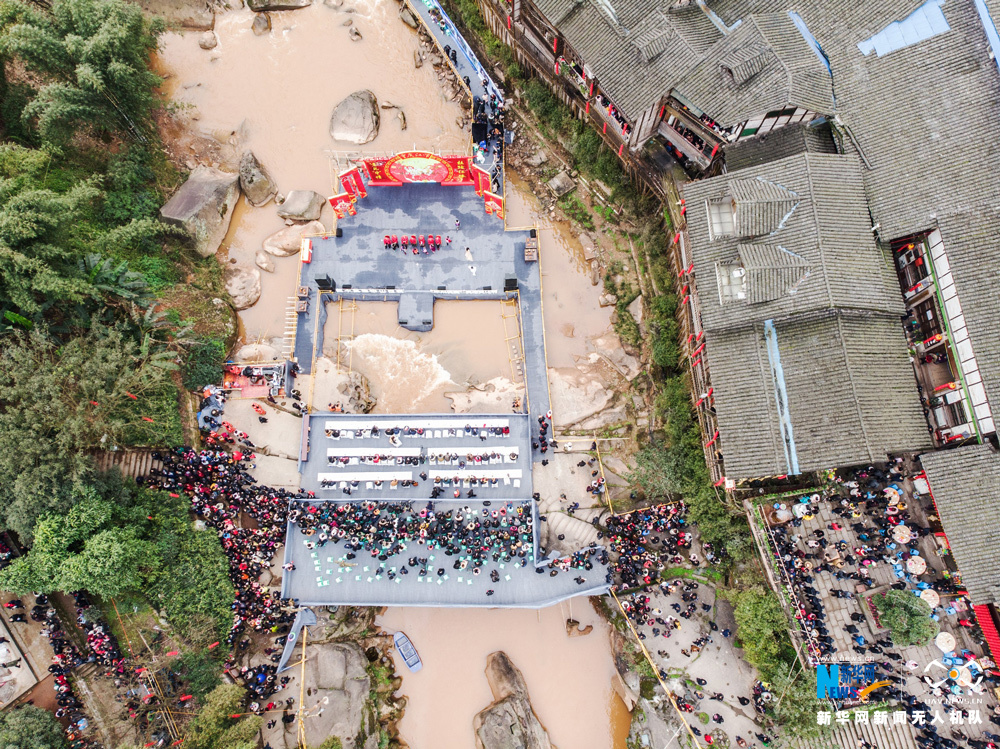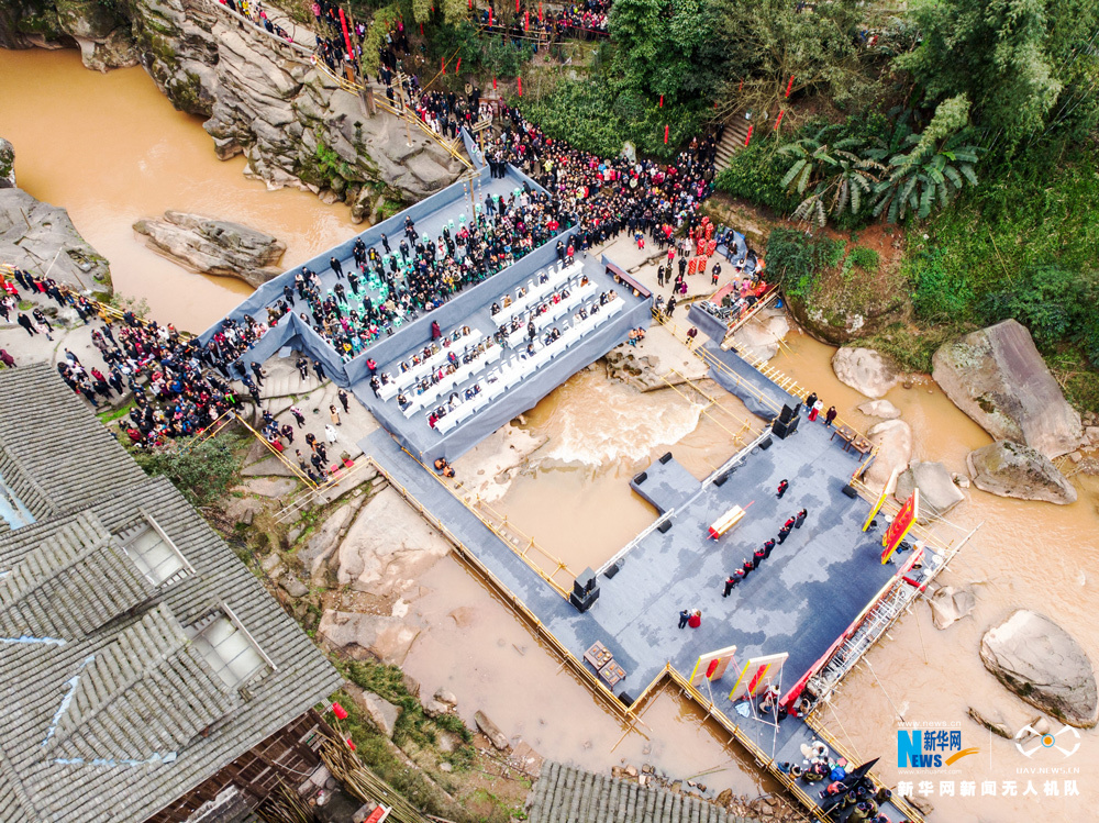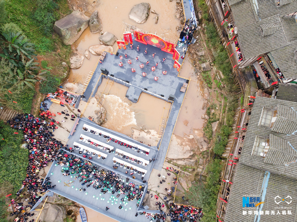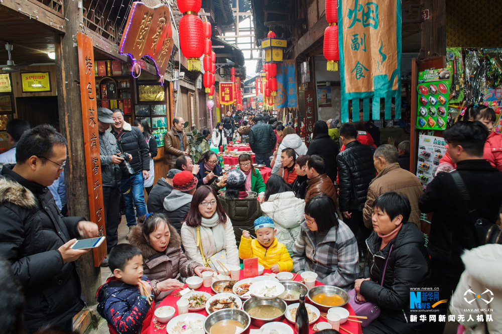 2月3日,第十三屆重慶江津中山古鎮(zhèn)“千米長(zhǎng)宴”民俗文化活動(dòng)舉行,熱情好客的古鎮(zhèn)居民擺下盛宴,來(lái)自四面八方的3萬(wàn)余名游客一邊品著地道的農(nóng)家菜,一邊欣賞“打盆上菜”絕技和傳統(tǒng)民俗文化表演,一起熱熱鬧鬧迎接新年。圖為無(wú)人機(jī)航拍“千米長(zhǎng)宴”現(xiàn)場(chǎng)節(jié)目表演。新華網(wǎng)發(fā)(龔祖章 攝) -