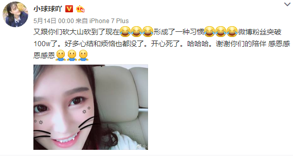 在微博粉絲突破百萬的當天,球球深夜發微博感謝粉絲一路的陪伴,表示與粉絲侃大山已經成為了一種習慣,言語中透露著粉絲破百萬的喜悅和感恩。