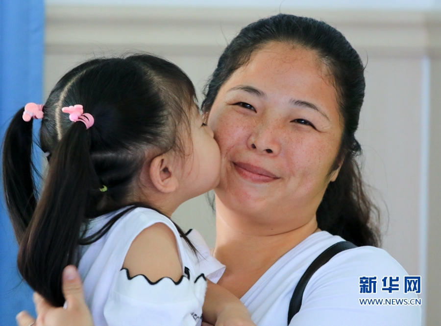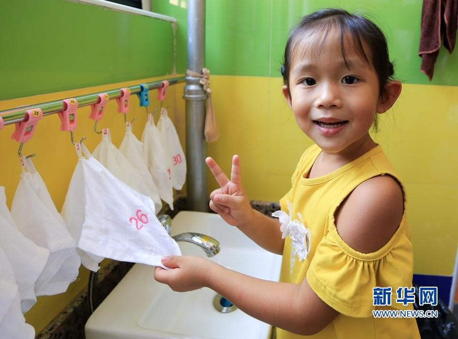 一名小女孩在洗手間找到自己的毛巾,十分高興。新華網 肖和勇 攝