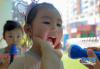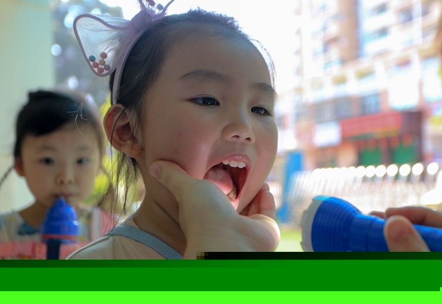 開園第一天晨檢,一名小女孩張開嘴露出一口潔白的牙齒。新華網 肖和勇 攝 -