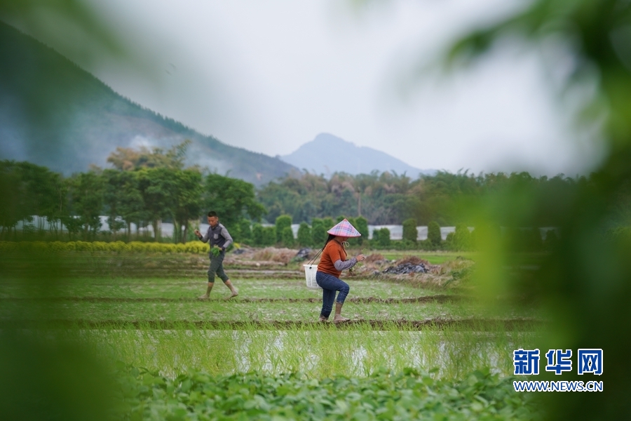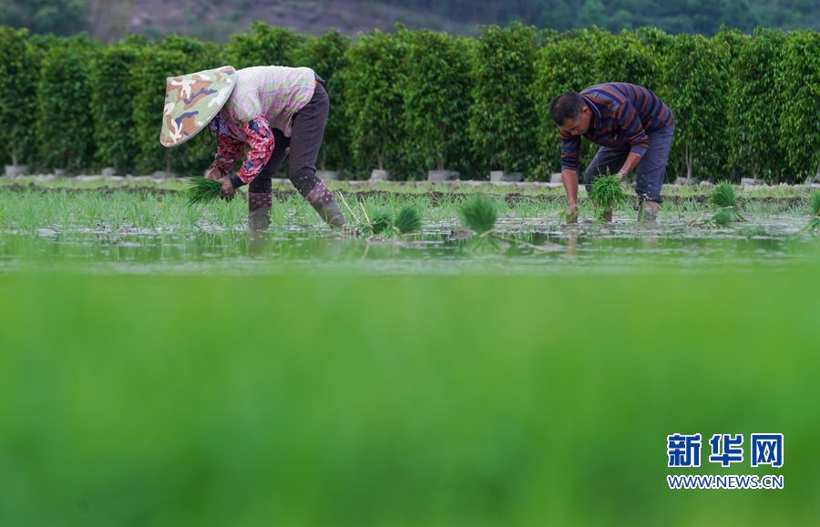 農(nóng)戶(hù)正在水田里拋秧。新華網(wǎng) 肖和勇 攝