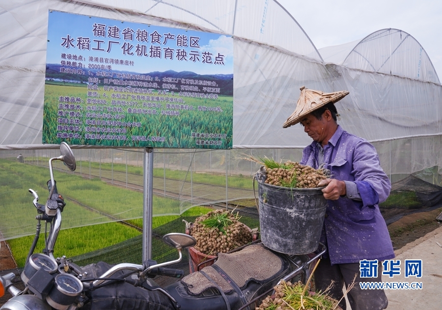 農(nóng)戶(hù)將秧苗放在插秧機(jī)機(jī)架上。新華網(wǎng) 肖和勇 攝