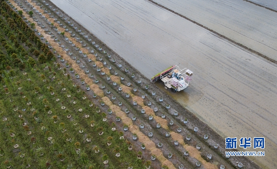 農(nóng)戶(hù)駕駛插秧機(jī)在水田里插秧(無(wú)人機(jī)拍攝)。新華網(wǎng) 肖和勇 攝