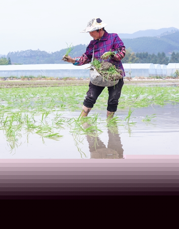 田間地頭,秧苗長(zhǎng)得郁郁蔥蔥,農(nóng)戶(hù)們不違農(nóng)時(shí),正在插秧。