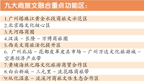 廣州市商務(wù)委副主任楊勇在論壇上首度公開了廣州市促進(jìn)商旅文融合發(fā)展的戰(zhàn)略規(guī)劃,其透露廣州市將打造廣州商旅文融合發(fā)展九大功能區(qū),其中包括了廣州塔珠江黃金水段商旅文示范區(qū)、北京路文化核心區(qū)、天河路商圈、漢溪-長隆-萬博商旅圈、西關(guān)文商旅活化提升區(qū)、廣州北站-花都皮革皮具市場-廣州萬達(dá)文化旅游城-空港經(jīng)濟(jì)產(chǎn)業(yè)帶、黃埔海絲之路文化旅游商貿(mào)合作區(qū)、白云新城-三元里-流花路商旅帶、從化溫泉-流溪河商旅文體生態(tài)合作區(qū)。