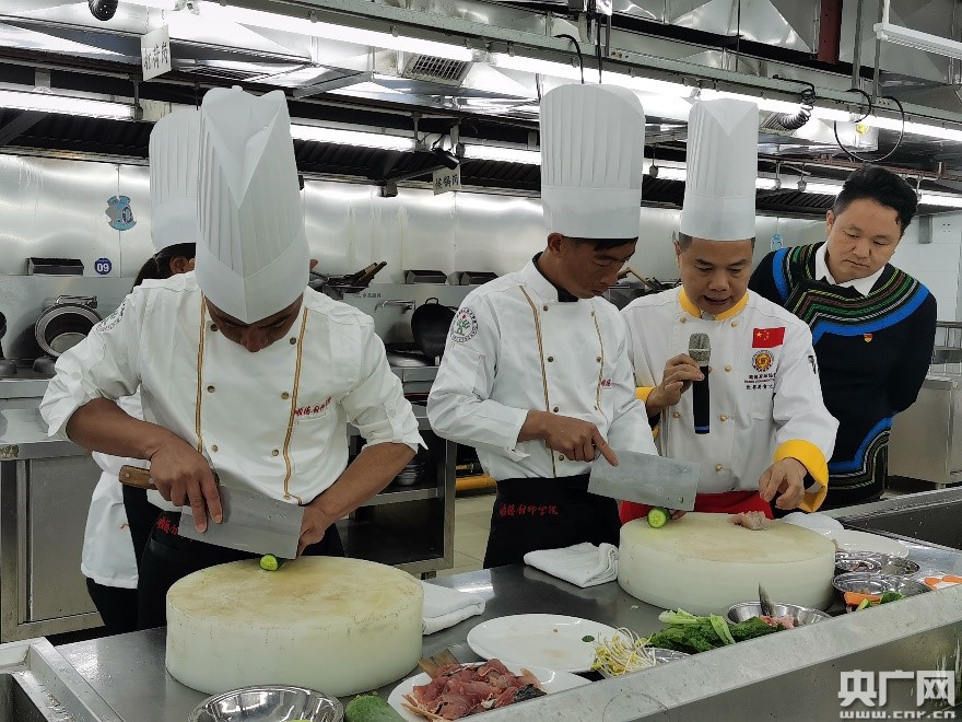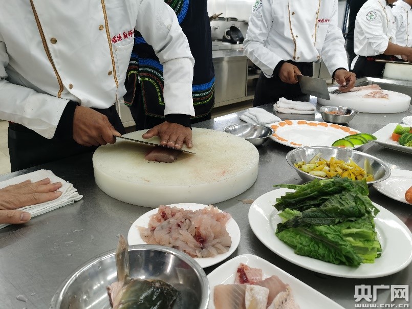 國賽選手楊東升與彝族學(xué)員同臺PK片魚刀工。(央廣網(wǎng)發(fā))