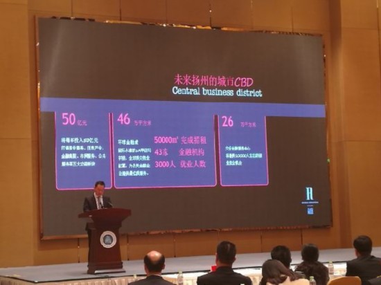 圖為揚州金融集聚區管理辦公室主任陳曉寶介紹未來揚州的城市CBD