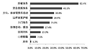 近年來,隨著養老照料中心、社區服務驛站等社區居家養老服務設施的逐步建設和服務內容的不斷豐富,老人對社區養老服務的需求也日趨旺盛。調查顯示,80.3%的被訪老人對社區居家養老服務有需求。從服務內容看,助餐服務是被訪老人首選,選擇比重為62.4%,其次是緊急救援服務,選擇比重為41.1%,文體娛樂活動、醫療康復護理和上門服務的選擇比重在25%-30.8%之間。此外,在有上門服務需求的被訪老人中,上門醫療呼聲最高,選擇比重為76.6%。
