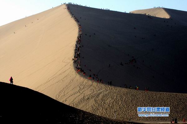 央廣網蘭州11月5日消息 甘肅鳴沙山月牙泉景區風光迷人,吸引了眾多中外游客。鳴沙山月牙泉位于甘肅省敦煌市城南5公里,沙泉共處,妙造天成,以“沙漠奇觀”著稱于世。新華社發(王將 攝)