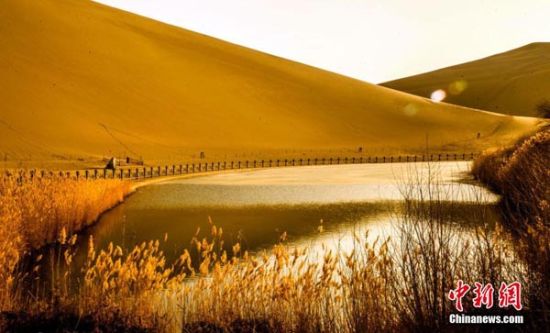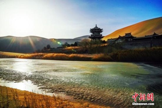 央廣網(wǎng)蘭州2月21日消息 羊年首日的朝陽灑在當(dāng)?shù)刂糜尉包c鳴沙山月牙泉上,氣勢恢宏的月泉閣與波光粼粼的月牙泉交相輝映。滑沙、騎駱駝登山、乘直升機鳥瞰敦煌大漠全景……絡(luò)繹不絕的游客在眼前醉人的大漠風(fēng)景里盡享新春的喜悅。王斌銀 攝