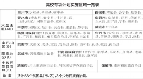 2016年實(shí)施高校專項(xiàng)計(jì)劃的院校由教育部直屬高校和其他自主招生試點(diǎn)高校承擔(dān)。甘肅省實(shí)施高校專項(xiàng)計(jì)劃的區(qū)域?yàn)檩爡^(qū)11個(gè)市(州)的58個(gè)集中連片貧困縣(市、區(qū))及甘肅省酒泉市肅北蒙古族自治縣、酒泉市阿克塞哈薩克族自治縣、張掖市肅南裕固族自治縣等3個(gè)少數(shù)民族自治縣。