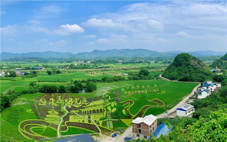 央廣網柳州5月28日消息(記者唐志強 通訊員林華美 孫如珠)“熱烈慶祝中國共產黨成立100周年”“永遠跟黨走”……時值初夏,在柳州市鹿寨縣中渡鎮馬安村一幅由褐、黃、綠不同顏色水稻“繪制”而成的“彩色稻田畫”,在藍天白云的映照下,壯觀、動人。