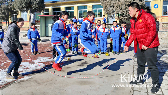 大學生志愿者與學生們共同跳大繩。曹建雄