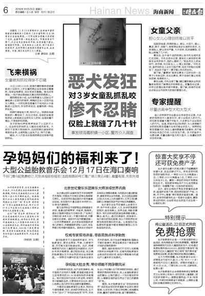 11月19日,在瓊海嘉積鎮(zhèn)前進(jìn)街廉租房小區(qū)院內(nèi),3歲女童阿萌被一條阿拉斯加雪橇犬抓咬得面目全非。本報關(guān)于此事的引起讀者的廣泛關(guān)注。受害女童的父母表示,將追究狗主人的相關(guān)責(zé)任。部分瓊海市民希望政府有關(guān)部門盡快出臺養(yǎng)犬相關(guān)管理辦法,規(guī)范市民的養(yǎng)犬行為,避免類似悲劇重演。