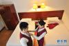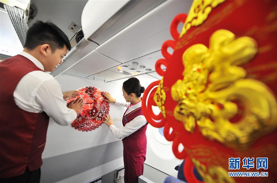 •      2月1日,寧儒(左)和梁鶴在旅客登機前裝飾客艙,讓旅客提前感受過年的喜慶氛圍。新華社發(楚洪雨 攝)