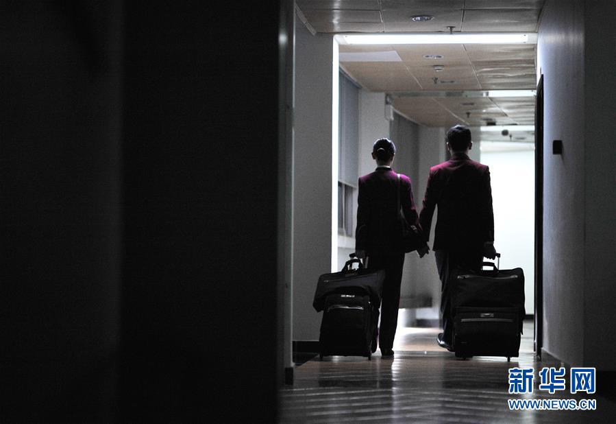 •      2月1日,在南航海口美蘭基地,梁鶴(右)在出發前為丈夫寧儒整理著裝。新華社發(楚洪雨 攝)   春運首日,南航90后夫妻乘務員寧儒和梁鶴共同執行從海口至哈爾濱的航班任務,一同在崗位上開始了春運的忙碌。小兩口于2015年入職南航,工作后相識相戀,于2017年結婚。