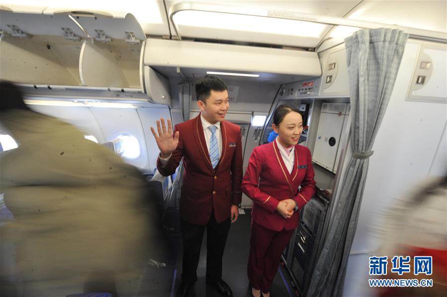 •      2月1日,寧儒和梁鶴在航班上為乘客服務。新華社發(楚洪雨 攝)