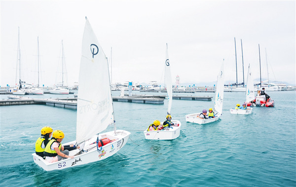 三亞半山半島帆船港附近海域,孩子們在學(xué)習(xí)操作帆船。 本報(bào)記者 武威 通訊員 董香云 攝