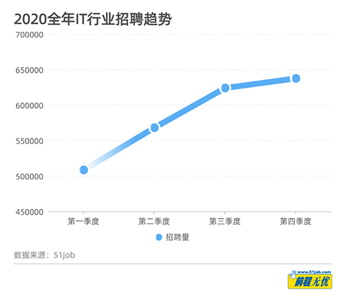 根據(jù)前程無憂無憂指數(shù)數(shù)據(jù)庫顯示,截止到2020年年底,IT類職能(IT類職能為:計算機/互聯(lián)網(wǎng)/通信/電子,下同)招聘職位總量近64萬個,與去年同期相比上升9個百分點。