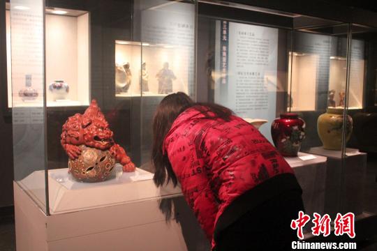 1月15日,河南省博物院,由愛國僑領陳嘉庚珍藏的70余件外國文物精品在此展出。圖為一名游客在“日本‘九谷’款紅釉獅子滾繡球”展品前定睛觀看!●R義恒 攝