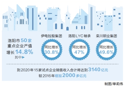 根據《意見》,洛陽市依托現代產業體系發展規劃,從全市先進裝備制造、新材料及有色金屬、高端石油化工、新能源、生物醫藥等產業中選取中信重工、洛陽LYC軸承、普萊柯生物等15家重點企業作為試點,開展提質倍增行動。根據洛陽市政府公布的《洛陽市重點企業提質倍增試點行動計劃表》,到2020年這15家試點企業銷售收入合計將達到3140億元,較2016年增加2000多億元。