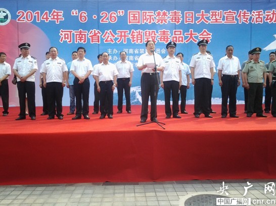 央廣網河南分網消息 (記者 李欽烽 通訊員 張波) 6月24日上午,由河南省禁毒委主辦、省公安廳承辦、鄭州市公安局協辦的“河南公開銷毀毒品大會”在鄭州新區藝術中心廣場隆重舉行。省政府副省長、省禁毒委主任李亞發表重要講話,省長助理、省禁毒委常務副主任、省公安廳廳長王小洪主持大會,省直有關部門負責同志,公安民警、武警和禁毒志愿者、社會各界群眾代表1000余人參加大會。