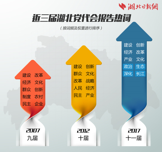 報告不僅回顧了過去5年來“五個湖北”建設和黨的建設取得豐碩成果,更開啟了湖北“建成支點、走在前列”新征程。近三屆湖北黨代會報告中哪些關鍵詞被提及次數最多?關鍵詞背后又有哪些深意?荊楚網絡大數據輿情中心將逐一為你解析。