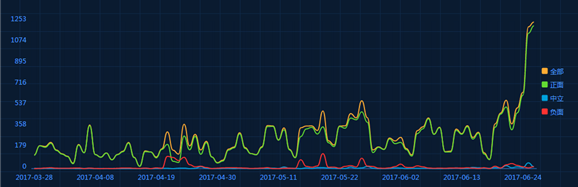 值得一提的是,荊楚網絡大數據輿情中心監測發現,今年湖北黨代會的預熱期長達約半年之久,早在2016年12月,已經有不少與黨代會相關的信息出現,在2017年1月的湖北省兩會期間,更是出現了一個輿論高峰期。而最近3個月,黨代會的相關報告也一直居高不下,各界對黨代會的關注度一直保持在一個較高的水準。6月25日,黨代會的召開將輿論情緒推向頂峰,并且還在不斷上升之中。