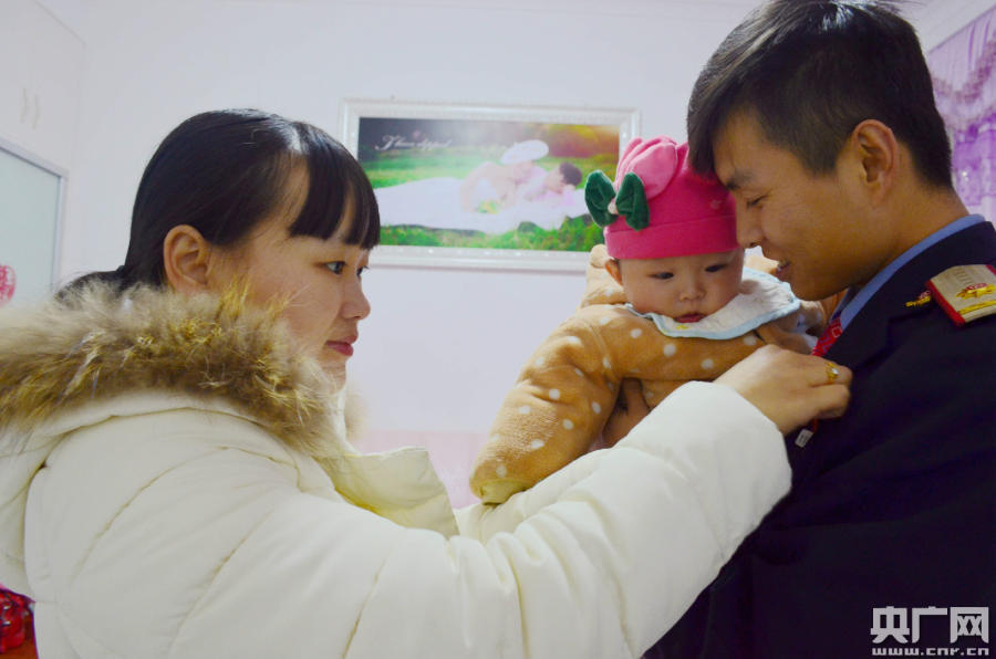 出乘前, 譚住寶再次抱了一下女兒。妻子白媛則在一旁為他整理領帶。這對小夫妻結婚一年,在一起的時間卻是少的可憐,剛結婚那會兒,白媛還有點抱怨,后來了解到忙是火車司機的職業特點,她也就慢慢理解,現在是非常支持老公的工作。但是,今天是除夕,老公卻要出乘,她還是有點不舍。 出乘前,妻子為譚住寶整理領帶 -