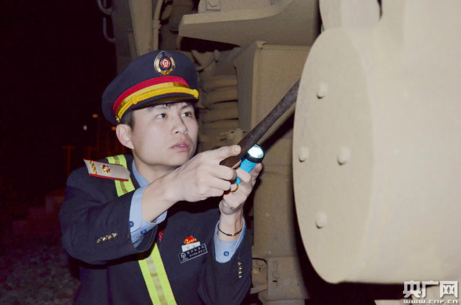 大年初一零時17分,T82次列車穩穩停靠在衡陽火車站2站臺,盡管天空中美麗的煙花還沒有謝幕,但是小譚已經無暇顧及。他在全神貫注地檢查機車,做好開車前的最后準備。 譚住寶在檢查機車 -