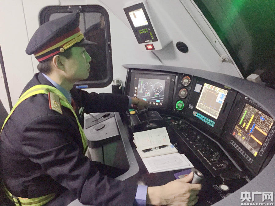 火車司機工作中除了需要精神高度集中,口、手、腳也不能閑著。一路上,每接近一架地面信號機,譚住寶便大聲呼喚信號顯示情況,右手做出手勢比對確認;通過車站時,用腳踩響鳴笛,一直忙個不停。這樣簡單卻又枯燥的動作,他一次出乘作業要重復超過300次。 譚住寶在執行標準化作業手勢 -