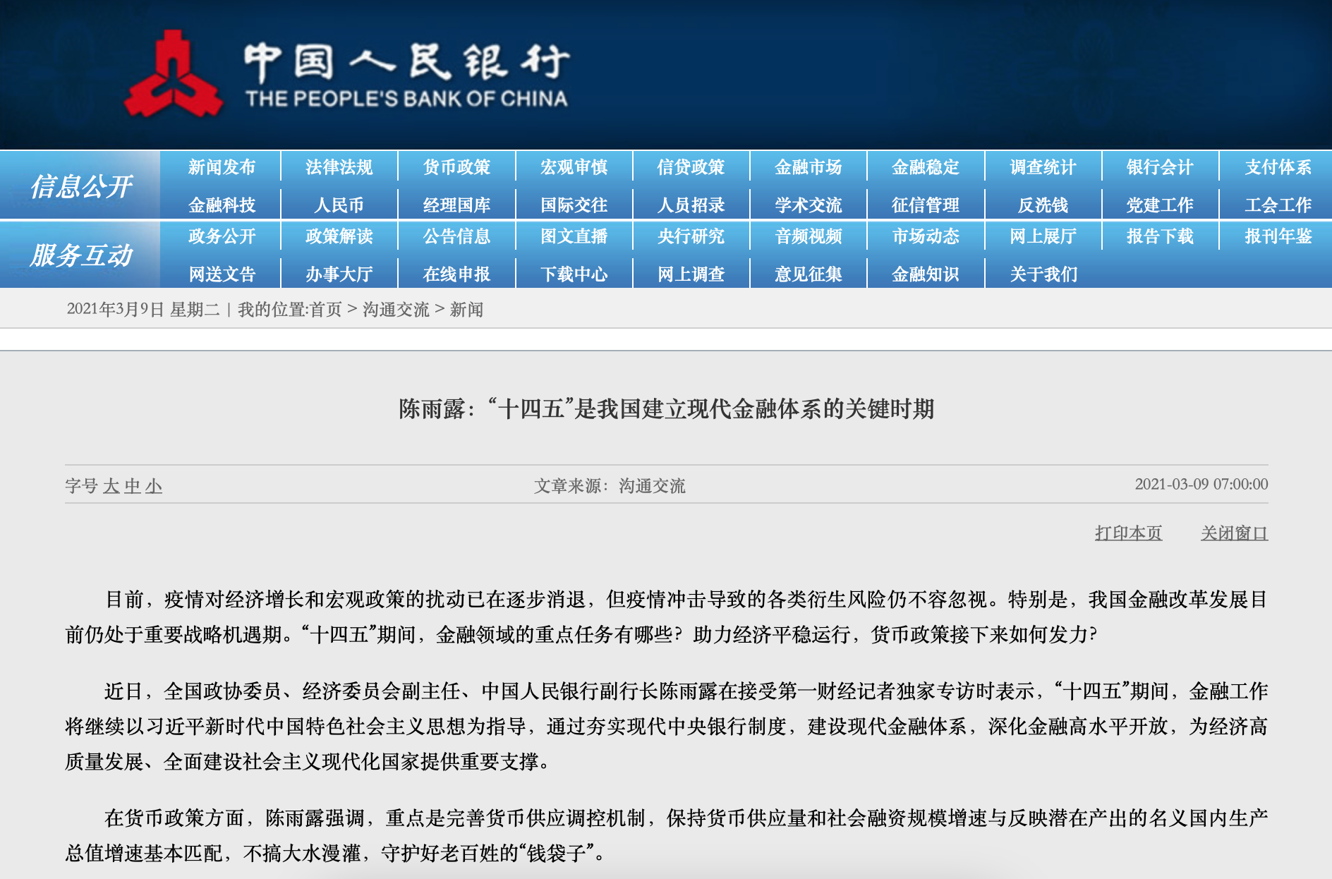 全國政協委員、經濟委員會副主任、中國人民銀行副行長陳雨露在接受媒體專訪時表示,在貨幣政策方面,重點是完善貨幣供應調控機制,保持貨幣供應量和社會融資規模增速與反映潛在產出的名義國內生產總值增速基本匹配,不搞大水漫灌,守護好老百姓的“錢袋子”。