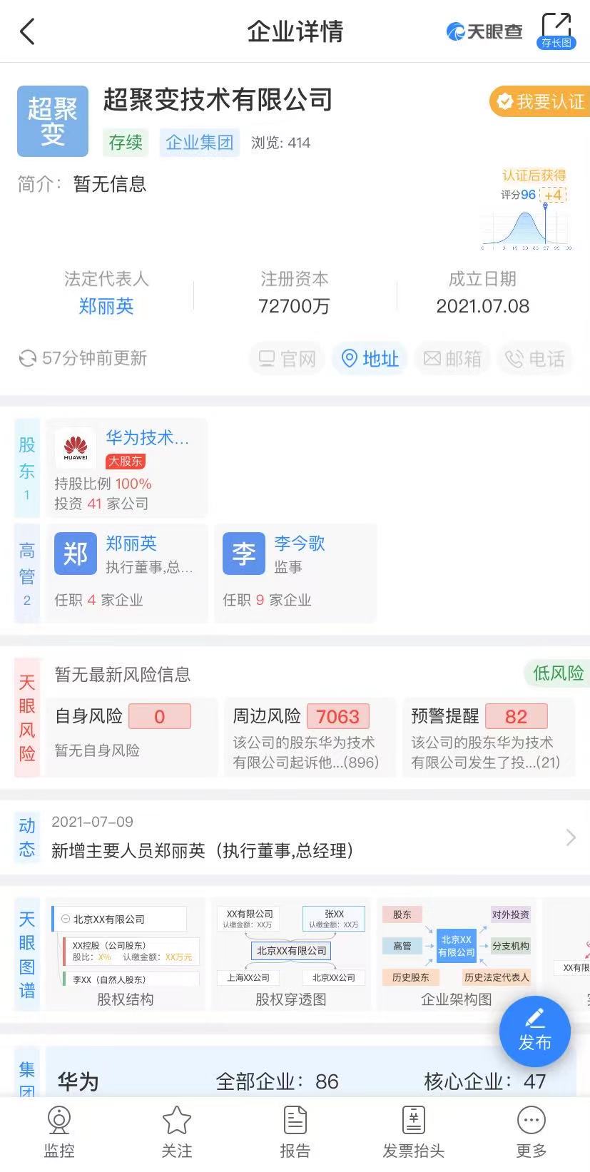 央廣網北京7月12日消息(記者 楊柳青)據天眼查顯示,7月8日,超聚變技術有限公司成立,注冊資本7.27億,法定代表人為鄭麗英,經營范圍包括信息安全設備制造;人工智能基礎資源與技術平臺;大數據服務;軟件開發;集成電路設計等。股東信息顯示,目前該公司由華為技術有限公司全資持股。