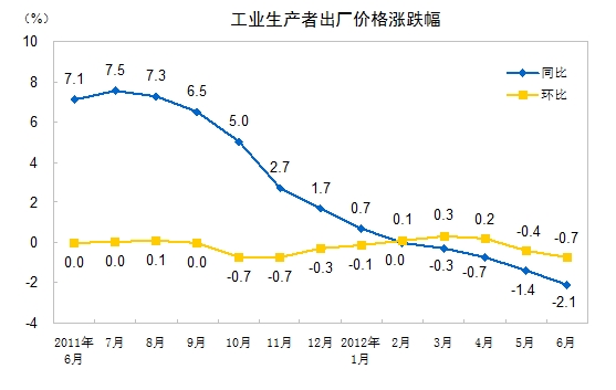 中廣網北京7月9日消息 國家統計局今日公布的數據顯示,2012年6月份,全國工業生產者出廠價格同比下降2.1%,環比下降0.7%。工業生產者購進價格同比下降2.5%,環比下降0.8%。上半年,工業生產者出廠價格同比下降0.6%,工業生產者購進價格同比下降0.3%。