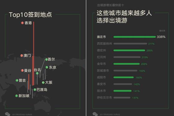 但隨著收入的提升和消費(fèi)升級,出境游已成為越來越多二三線城市居民的度假選擇,微信的統(tǒng)計數(shù)據(jù)顯示,廣西、云南、陜西等省份的居民選擇出境旅游的人數(shù)也在快速上升,其中,廣西省崇左市微信用戶的出境人數(shù)增長率達(dá)338%。