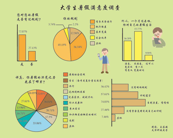 調查結果顯示,72.87%的受訪大學生對暑假作過規劃,45.15%的受訪者認為規劃“執行較差”,12.56%的受訪者表示“基本荒廢”。在暑假滿意度問題上,36.22%的受訪大學生對自己的暑假生活表示“滿意”,52.73%的大學生認為滿意程度與金錢無關。而對暑假生活“不滿意”的主要原因包括“自制力差,有惰性”“計劃落空”“沒有明確規劃”。
