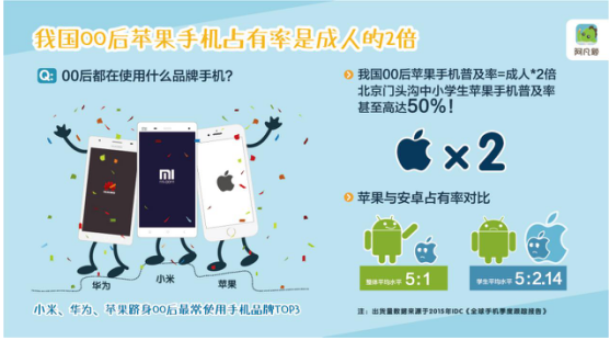 阿凡題報告指出,在擁有手機的00后當中,小米、華為、蘋果順利躋身他們最常使用手機品牌TOP3。更值得注意的是,對比蘋果與安卓手機的出貨量情況,我國00后蘋果手機的普及率已是成人的2倍,在北京門頭溝地區中小學生蘋果手機普及率甚至高達50%!