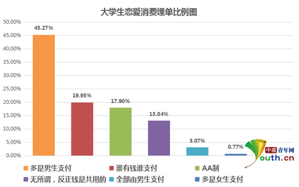 在購(gòu)物消費(fèi)時(shí),由誰(shuí)埋單呢?根據(jù)中國(guó)青年網(wǎng)調(diào)查顯示,“多是男生支付”比例最高,占45.27%;其次是“誰(shuí)有錢(qián)誰(shuí)支付”和“AA制”,分別占19.95%、17.9%;“全部由男生支付”占3.07%,“多是女生支付”僅占0.77%,“全部由女生支付”則無(wú)人選擇;此外,還有13.04%的學(xué)生選擇“無(wú)所謂,反正錢(qián)是共用的”。