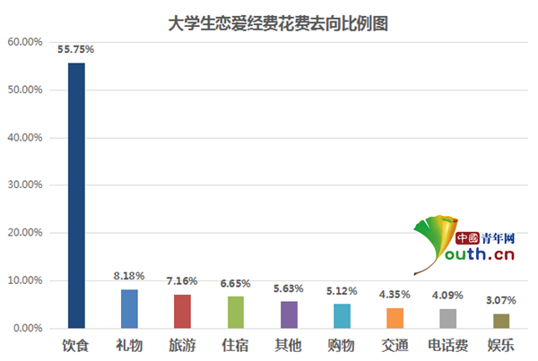 在戀愛(ài)消費(fèi)中,什么占最大比例呢?“買(mǎi)吃的是最主要的消費(fèi)吧。”新鄉(xiāng)學(xué)院的王鵬飛在回答中國(guó)青年網(wǎng)記者提問(wèn)時(shí)表示,剛戀愛(ài)一個(gè)月,為了買(mǎi)好吃的已經(jīng)花掉了自己和女朋友1600元。根據(jù)中國(guó)青年網(wǎng)調(diào)查,55.75%的大學(xué)生認(rèn)為在戀愛(ài)消費(fèi)中“飲食花銷(xiāo)最大”。