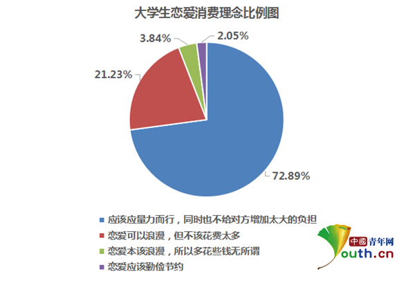 根據(jù)中國(guó)青年網(wǎng)調(diào)查數(shù)據(jù)顯示,在戀愛(ài)消費(fèi)理念方面,有72.89%的學(xué)生認(rèn)為雙方“應(yīng)該量力而行,同時(shí)也不給對(duì)方增加太大的負(fù)擔(dān)”,其次為“戀愛(ài)可以浪漫,但不該花費(fèi)太多”占21.23%,僅有3.84%的學(xué)生認(rèn)為“戀愛(ài)本該浪漫,所以多花些錢(qián)無(wú)所謂”。由此可見(jiàn),大學(xué)生戀愛(ài)消費(fèi)理念相對(duì)理性。