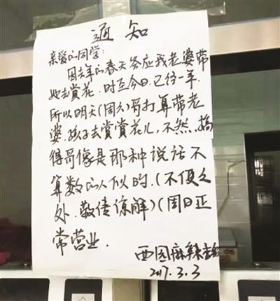 今年3月7日,多名該院同學在網上發布的一則趣聞,引大量網友關注:該校食堂一麻辣香鍋大廚一年半來,先后貼出的4張暫停業通知單,連成了一條“人生贏家之路”。4張停業通知分別是:2015年中秋因回家相親停業一天、因中秋相親失敗圣誕期間再相親停業兩天、去年底因老婆臨產停業三天、今年3月初帶老婆孩子去看花停業一天。相較平日常見的“因故停業”通知,這些通知頗顯另類。