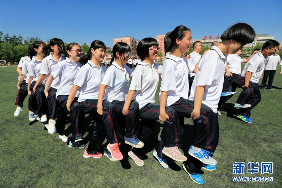 6月6日,河北省衡水市第二中學高三學生在運動場上通過趣味運動釋放考前壓力。當日,記者從教育部獲悉,2017年全國統一高考將于6月7日至8日進行,部分省(區、市)由于考試科目設置不同,9日仍安排有考試科目。今年全國高考報名考生共940萬人。新華社記者 牟宇 攝 -