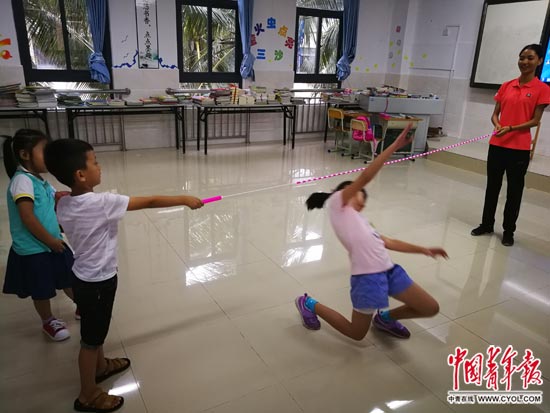 臺風要來了,外面雨很大,剛剛師范畢業的張開利正在帶3個孩子上室內體育課。